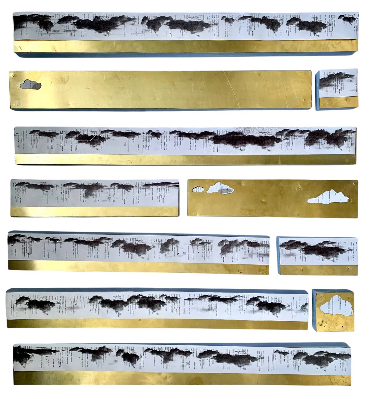 Маргарита Иванова (род. 2001). Без названия. Из серии «Свинцовое небо». 2025. Латунь, чековая лента, дерево, акрил, выпиловка, печать. Собственность автора.