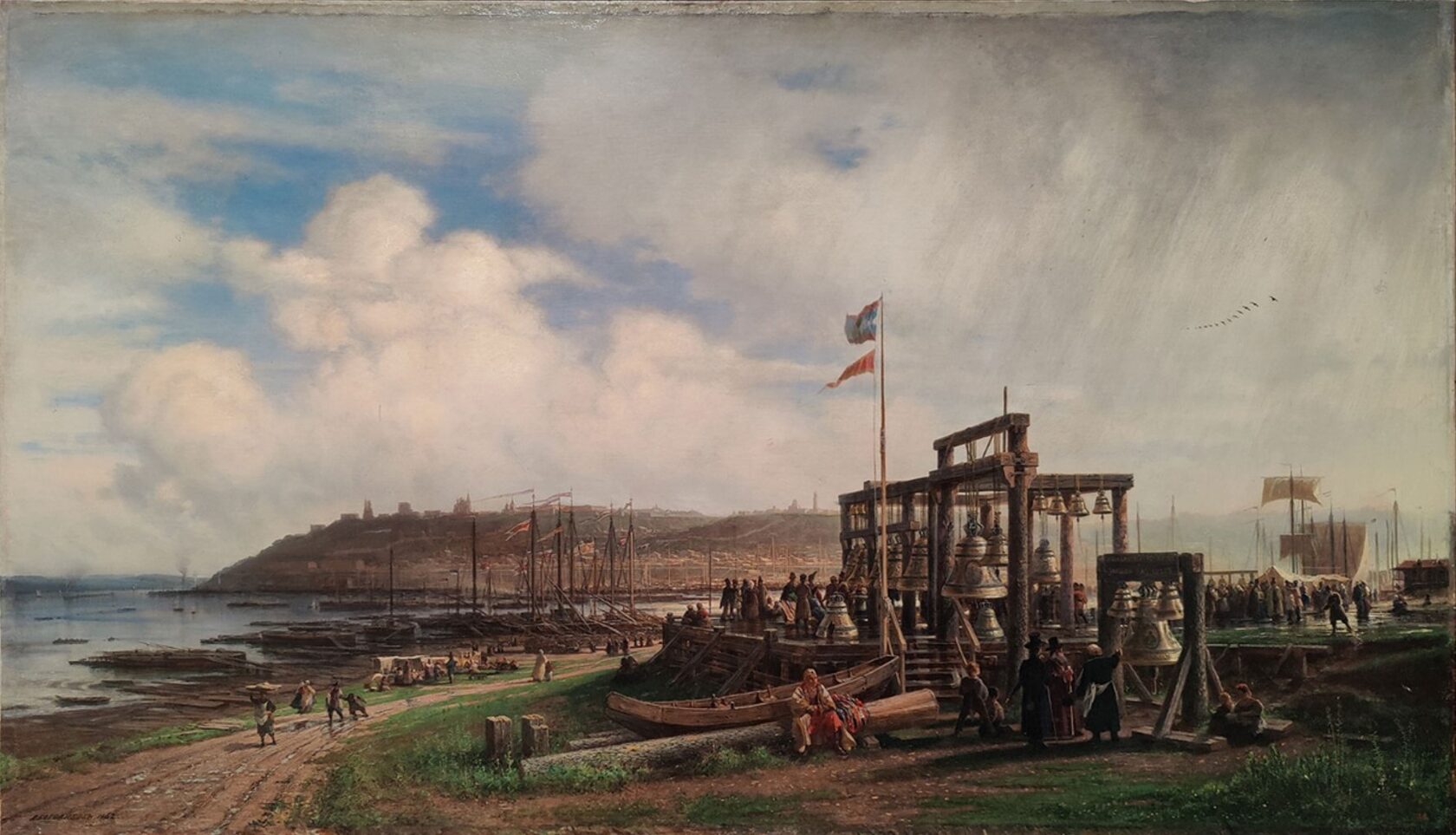 На картине изображен вид на Нижегородский кремль со стороны колокольного ряда Нижегородской ярмарки. Колокола — тяжелый и дорогой товар, поэтому их транспортировали по воде и традиционно располагали ближе всего к устью Оки: там, где сейчас находится собор Александра Невского. За торговыми рядами художник изобразил причал и суда, на которых и привезли груз.