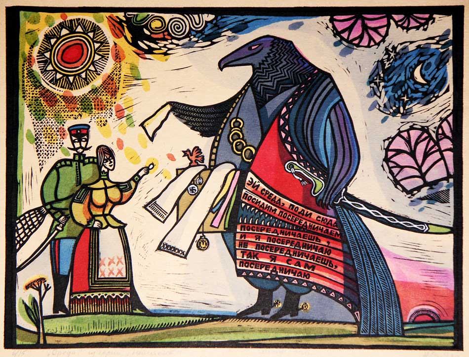 Юрий Бессмертный (род. 1964). Среда. Из серии «Неделя слов». 1992. Линогравюра, ручная раскраска. Собственность автора. Предоставлено Ростовским областным отделением ВТОО «Союз художников России».