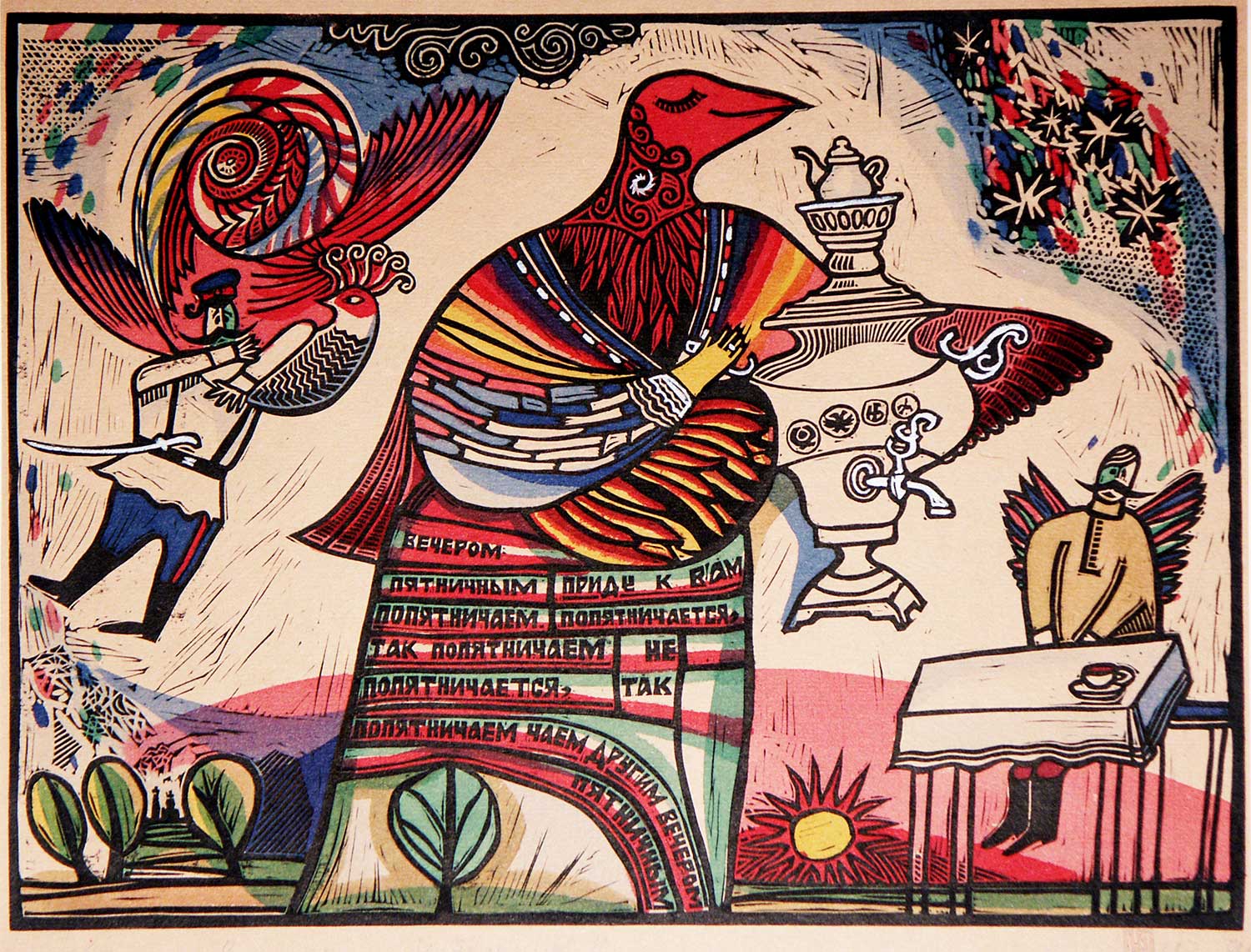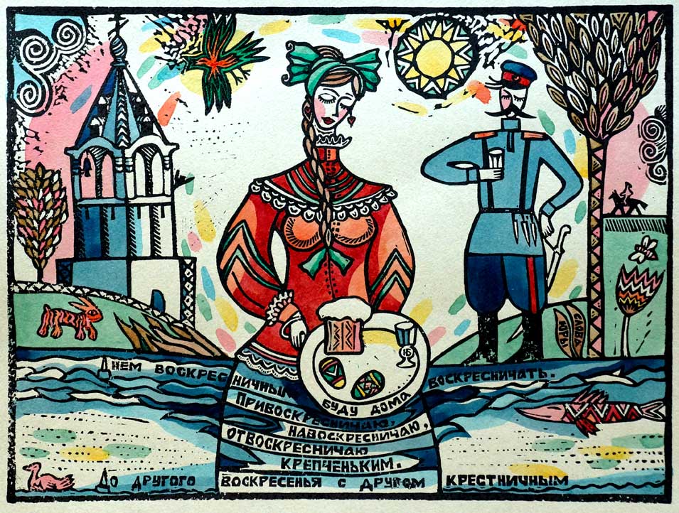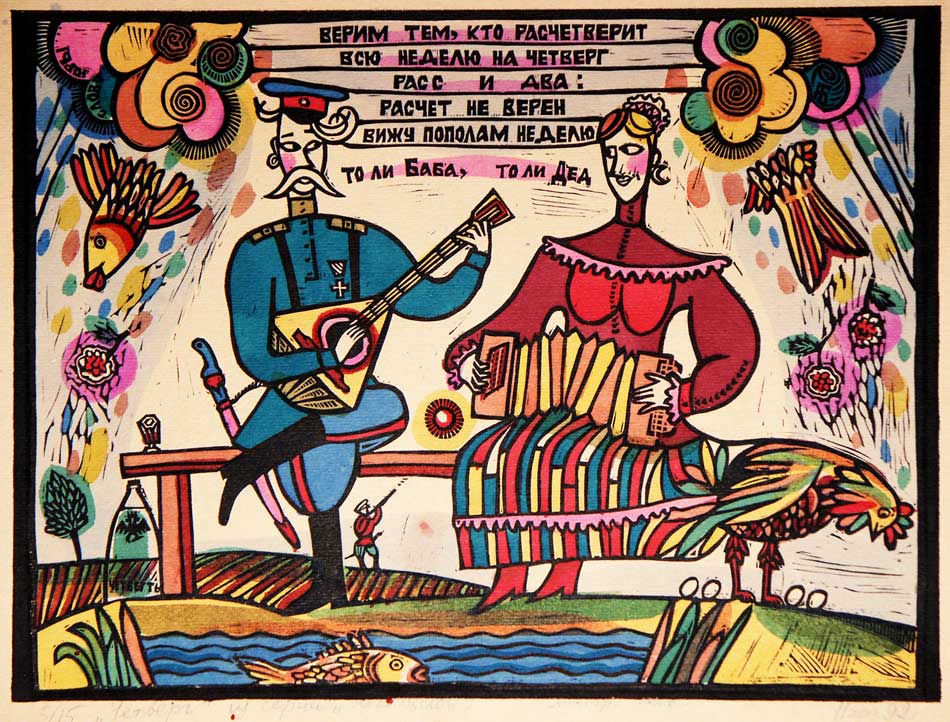 Юрий Бессмертный (род. 1964). Воскресенье. Из серии «Неделя слов». 1992. Линогравюра, ручная раскраска. Собственность автора. Предоставлено Ростовским областным отделением ВТОО «Союз художников России».