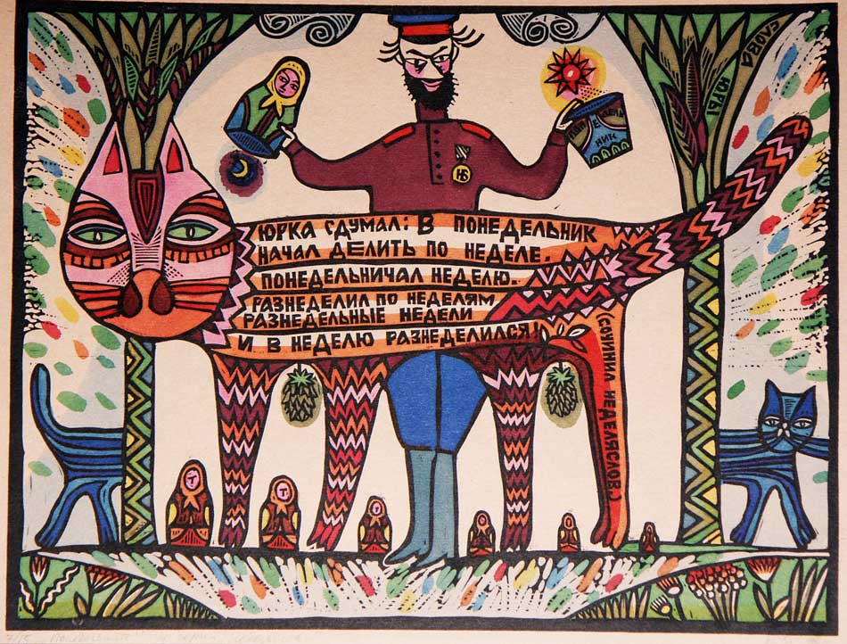 Юрий Бессмертный (род. 1964). Понедельник. Из серии «Неделя слов». 1992. Линогравюра, ручная раскраска. Собственность автора. Предоставлено Ростовским областным отделением ВТОО «Союз художников России».