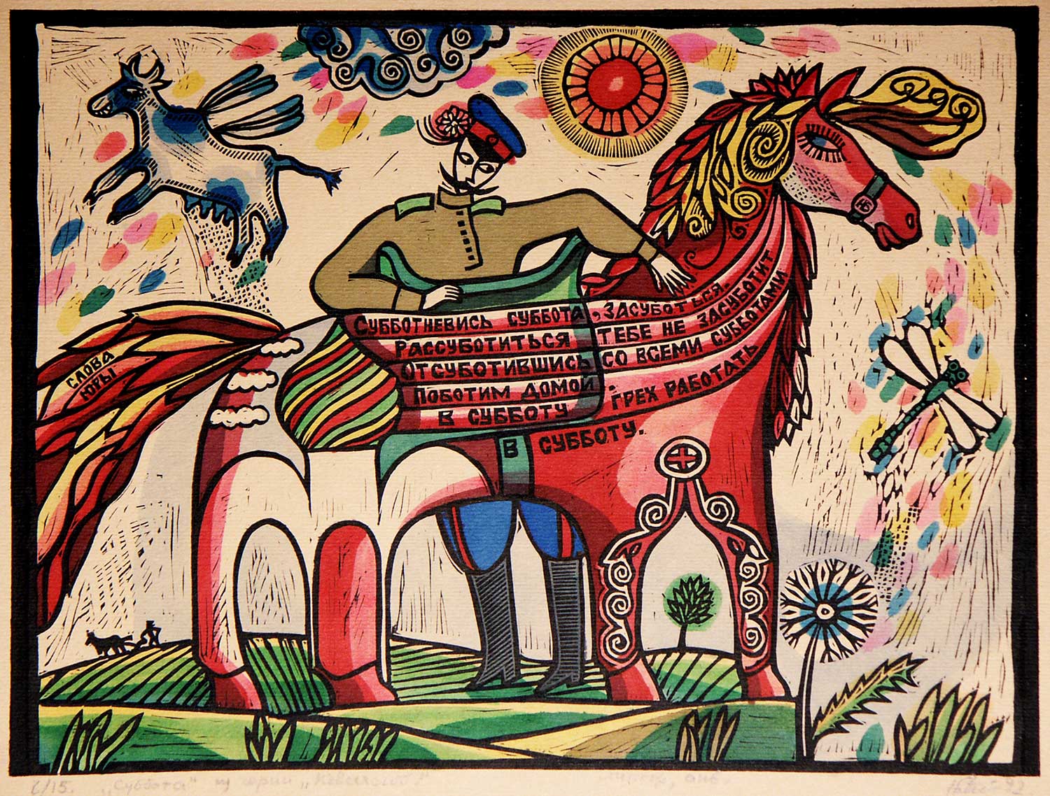 Юрий Бессмертный (род. 1964). Суббота. Из серии «Неделя слов». 1992. Линогравюра, ручная раскраска. Собственность автора. Предоставлено Ростовским областным отделением ВТОО «Союз художников России».